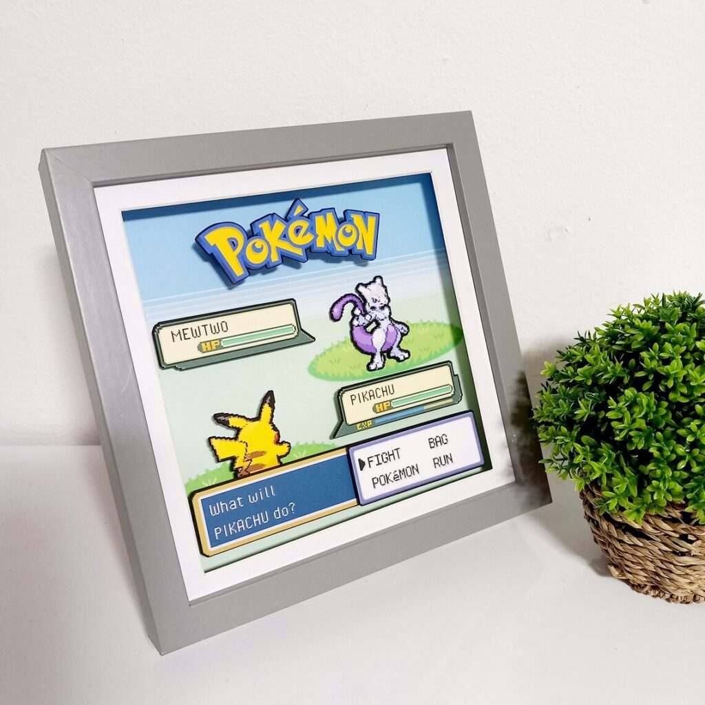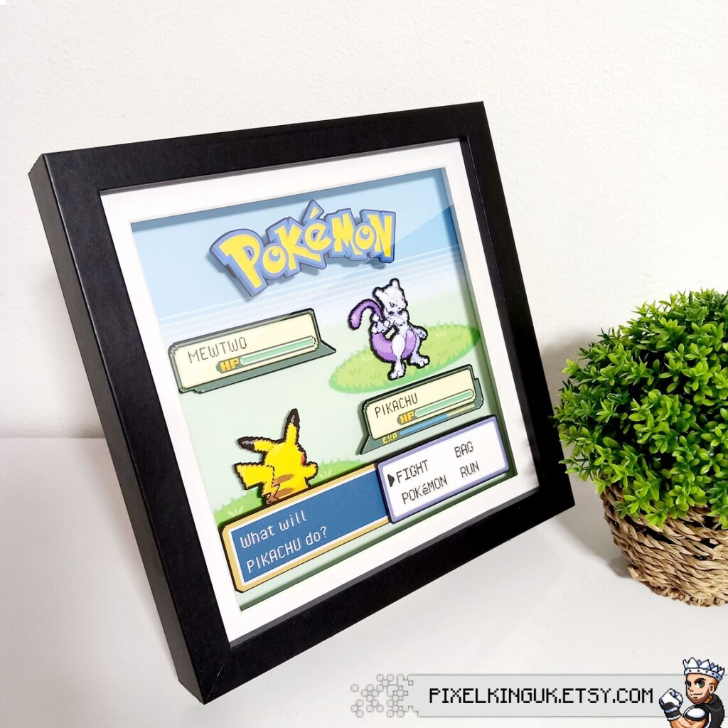 One of the defining features of this shadow box is its customizability. You have the power to choose the two Pokemon that will grace this unique display. Whether it’s the classic duo of Pikachu and Mewtwo, or if you have a more obscure pairing in mind, the choice is yours. Simply enter your preferred Pokemon A and Pokemon B in the designated field (on etsy) or send me a direct message (on etsy). I will bring your vision to life, ensuring that your unique Pokemon duo shines in all it’s pixelated glory.